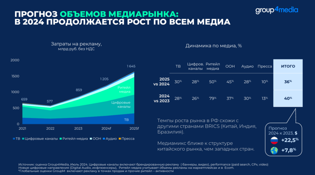 В первом квартале 2025 г. рост рынка ooh-рекламы, по оценкам «Родной Речи» составил 20%. По итогам 2025 г. объём индустрии увеличится на 20%, до 117 млрд руб., по итогам 2026 г. – на 13%, до 132 млрд руб.