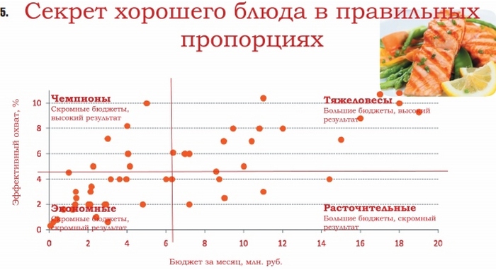 Давайте теперь, разделим поле рекламных кампаний на четыре квадрата (рис.5). Точкой деления является средний бюджет и средний показатель охвата, достигаемый за этот бюджет.